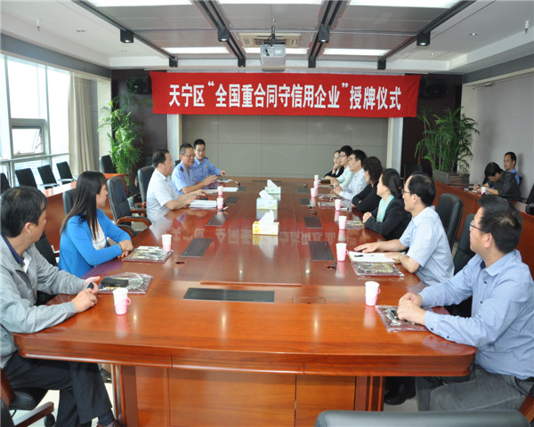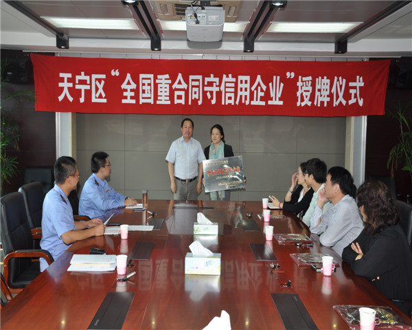 10月11日14:30,在天宁区政府九洲环宇A2115会议室召开全国“守信用重合同企业”授牌仪式。天宁区所属黑牡丹集团、江苏建设控股集团有限公司、常州制药厂有限公司、常州四药制药有限公司、常州特种变压器有限公司五家复评单位以及包括我公司在内的三家初评单位参加了本次授牌仪式。继我公司2006年首度获评“全国守信用重合同企业”以来,本次已是二次“加冕”成功。