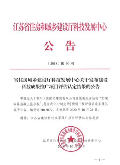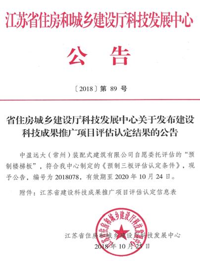 中盈远大积极响应省政府号召,紧跟“三板”步伐,决心为“预制三板”在全省范围内的推广应用贡献自己最大力量。公司自7月份便着手申报省住建厅建设科技成果推广项目(即“预制三板”推广项目)的评估认定。经过层层筛选、逐级考核,2018年10月25日公司最终顺利通过“预制楼梯板”、“预制叠合板”的推广评估认定。