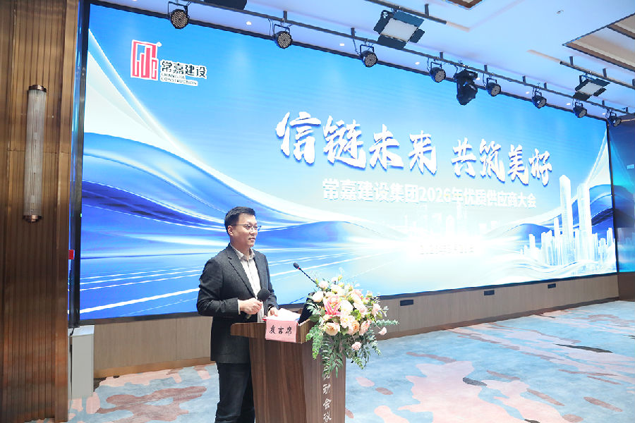 春意盎然,万象更新。3月29日,常嘉建设2026年优秀供应商大会在悦动广场创智大厦隆重举行,近百家核心供应商代表与集团管理层齐聚一堂,共叙情谊、共话新篇。本次大会以“信链未来 共筑美好”为主题,既是年度合作总结与展望,更是集团在行业调整期,携手伙伴打破“点对点”模式,构建“合规、有序、共赢”产业生态的关键举措。