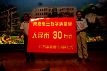 市一中是一所有着近百年历史的国家级示范高中、江苏省首批四星级高中,具有优良的校风、教风和学风。学校坚持“尊重、支持、合作、发展”的办学理念,为国家及地方建设培养了一代又一代的优秀人才,为我市教育事业作出了杰出贡献。过去的一年,该校倡导增效减负,践行素质教育。各项竞赛,刷新历史,中考高考,再创辉煌。公司这次出资30万元设立常州市第一中学“常嘉高三教学质量奖”,是继2010年出资30万元赞助省运会常州男子足球队暨设立常州市第八中学“常嘉建设.蓝天励志”奖(助)学基金后的又一助学举措,体现了公司对我市教育事业的不懈支持。