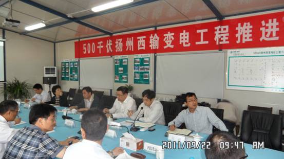 9月20日,省电力公司副总经理孟庆强、总经理助理兼建设分公司总经理肖向东、省电力公司基建部主任张建平、建设分公司副总经理汤新光、邵勤等一行来500kV扬州西工程检查指导工程建设。