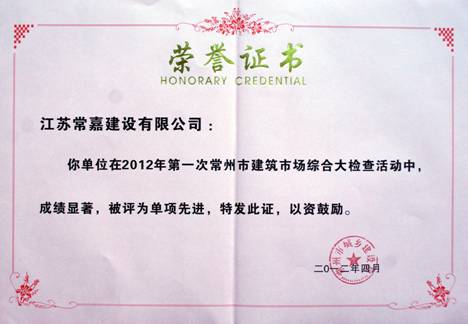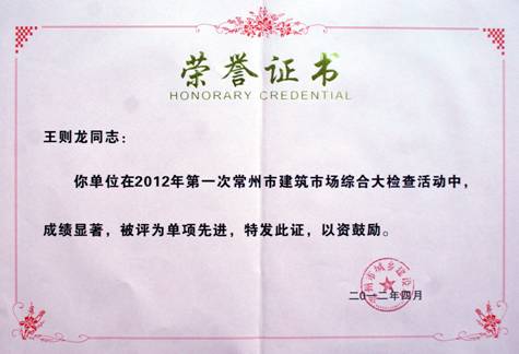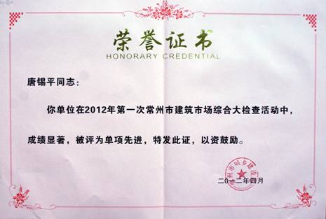 在本次综合大检查中,我公司因工作扎实有力、成效显著被评为单项先进,中意宝第21#房、青竹苑二标段、富利康、纬荣纺织四个项目分别受到通报表扬(其中富利康、纬荣纺织项目还分别被武进区建设局、戚墅堰区建设局通报表扬);此外,中意宝第21#房(项目经理唐锡平)及青竹苑二标段(项目经理王则龙)被评为单项先进。