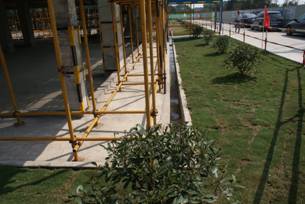 进入五标段施工现场,如同走进了一个绿色小公园,节能环保细节处处可见:充分利用了原有水泥道路,保留了原有树木,沿用化粪池和部分管道,避免了重复施工污染与资源浪费。采用太阳能路灯、配备完整的雨水收集系统(明沟、雨水收集池、三级沉淀池)和污水处理系统(污水池和三级沉淀池),解决了工程的照明和砼养护、绿地灌溉,同时还提供了少量生活用水。办公区与生活区全部临建设施都采用了可回收的复合彩钢板活动用房。项目部还别出心裁地用可重复利用的清水墙结合废旧木料拼接而成园林式木栏杆进行了功能分区,实用性与美观度兼得,颇有情趣。车辆冲洗台、分类垃圾桶、洒水车、分路水表和电表、噪音监测点、节水龙头、施工物料的分类摆放(成品、可回收利用、废料分类分区堆放)、短木接长、直螺纹连接等细节都体现出了项目部对节能环保的用心。