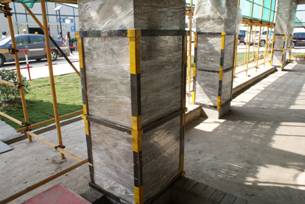 在质量管理方面项目部也处处用心:为确保钢筋绑扎质量,避免人为踩踏造成损坏,项目部利用残旧钢筋边角料加工成了浇捣跑道马凳,上面铺设木板供钢筋工行走;基础构造柱拆模板后先采用喷雾剂再外裹农用薄膜,然后用废旧木料加工成护板保护住四角;以上变措变废为宝,既保障了工人的施工安全,也有效地实现了成品保护。86系列全钢大模板浇筑框架结构,混凝土采用输送泵、布料机直接入模,后浇筑部位采用独立支撑体系等技术应用也有效保障了建筑质量与节能的双重需求,提高了工效。
