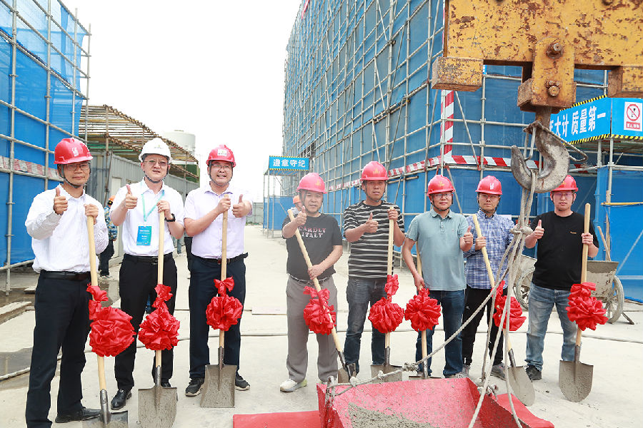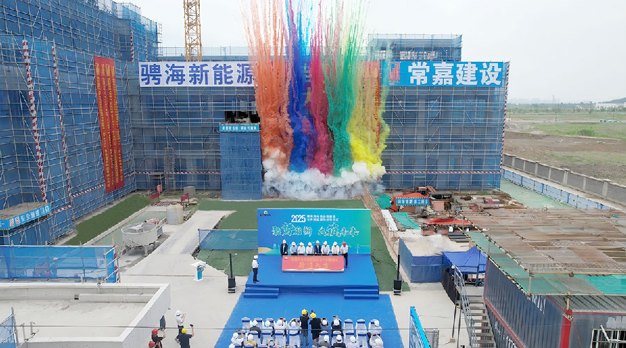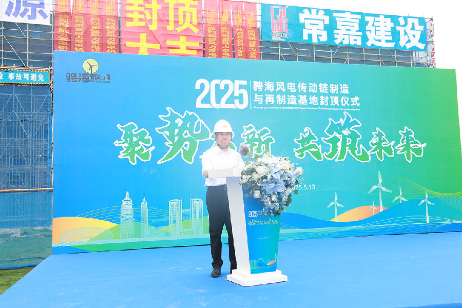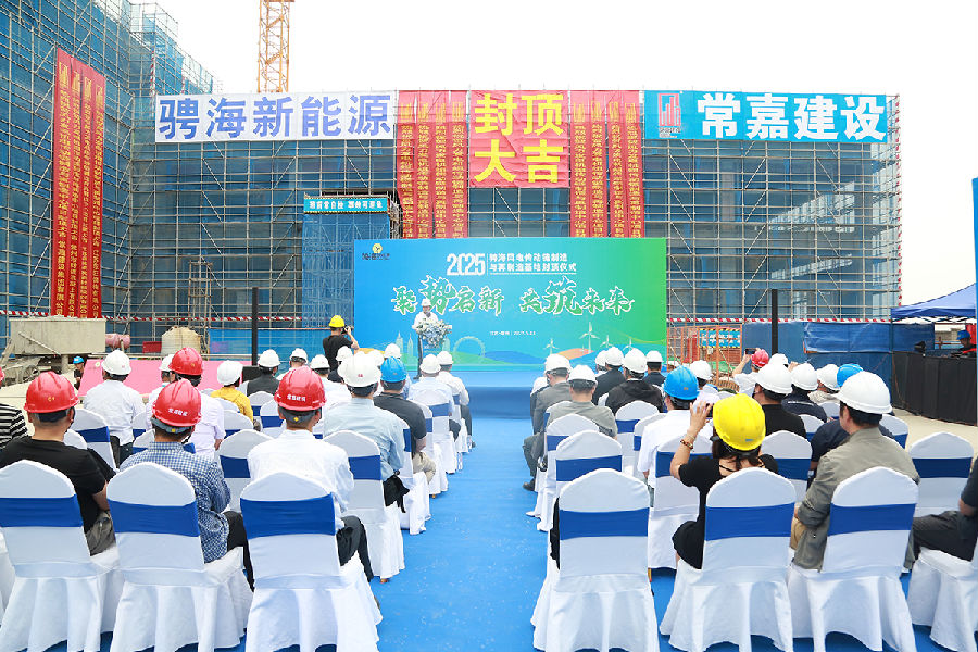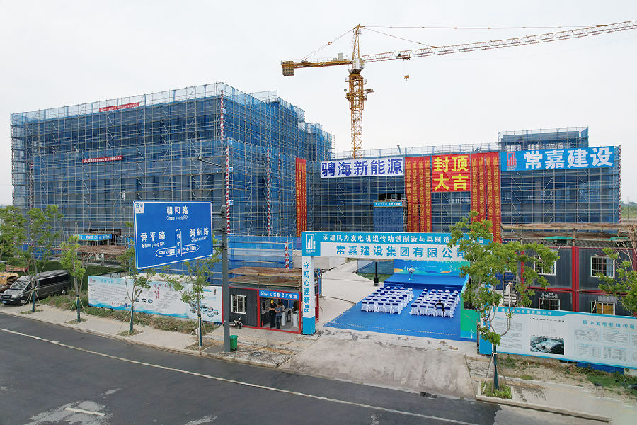 5月13日,由常嘉建设承建的骋海风电传动链制造与再制造基地项目封顶仪式隆重举行。中国电力设备管理协会新能源运维专委会主任委员张晓朝、中关村智慧能源产业联盟理事长李斌、中国可再生能源学会副理事长祁和生、华北电力大学新能源学院院长代表王永教授、上海骋海新能源总经理倪达、常嘉建设总经理李学鹏等嘉宾出席,共同见证这一重要时刻。