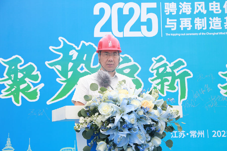 在封顶仪式上,张晓朝和王永分别致辞。张晓朝代表相关协会祝贺上海骋海新能源科技有限公司,感谢支持项目建设的单位和个人。他指出,骋海新能源从配合国外厂商起步,现已成为行业龙头,项目封顶是阶段性胜利,期待各参建单位继续推进后续工程,确保顺利投产。王永代表新能源学院祝贺骋海,强调风电产业对双碳目标的重要性,肯定骋海在技术创新和管理上的标杆作用,期待与骋海加强合作,推动行业技术进步和标准升级。