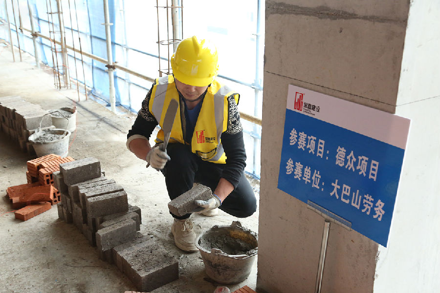 砌筑工选手严格对标图纸,从精准放线到“三一”砌砖法(一铲灰、一块砖、一挤揉)的运用,全程一丝不苟。赛场上,砖缝均匀、横平竖直,墙体平整度与垂直度均控制在毫米级误差内,生动诠释了建筑工匠“差之毫厘,谬以千里”的严谨态度。